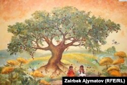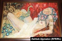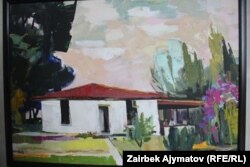 - Бул жерде сиздердин көңүлүңүздөрдү Москва сүрөтчүлөр институтун бүткөн таланттуу сүрөтчү Кадыр Бековдун керемет чыгармаларына бурабыз. Бул авторду заманбап нукта иштеген сүрөтчү десек болот. Көргөзмөгө анын "Бийкеч", Италияда тарткан "Кызыл чатыр" аттуу иштери коюлду. Санкт-Петербург университетинин бүтүрүүчүсү Халида Шимованын "Күнөстүү", "Алмалууда" аттуу эмгектери бар. Мына, караңызчы, мында алма багынын түбүндө эки көчөт кыз отурат. Теребелде мемиреген тынчтык. Дегеле көргөзмөдөгү ар бир сүрөт шаардын ызы-чуусунан алыс, мемиреген айыл турмушун чагылдырат. Тиги сүрөттө болсо жайдын толгон кези, гүл жайнаган талаа, мелмилдеген көл, тунжураган токой... Айтор, бул көргөзмөгө коюлган ар бир картинадан жуурулушкан табияттын бакытка тунуп турган керемет кезин көрөбүз.