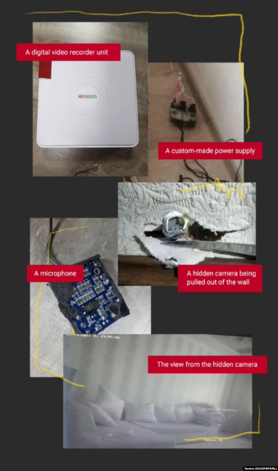 Ошондой эле "Азаттык” радиосу, OCCRP жана Kloop медиасы жарыялаган бул иликтөөдө былтыр октябрь айында Болот Темиров жашап турган батирден санарип видеокамера, Wi-Fi роутери менен табылганы да айтылат. Ал камера конок бөлмөнү тартып турган. Темиров өз батиринде жаздырылганын айткан бир катар аудиолор кийинчерээк интернетке жарыяланган ага каршы видеолордо колдонулду.