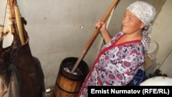 Алайдын Чыйырчык жайлоосунда бээ салып аткан Гүлжамал Жетибаева кымызды жыгач бочкеге ачытат. Муну деле арчага, же жыттуу чөптөргө ыштап анан бишкек менен бышып кирет: