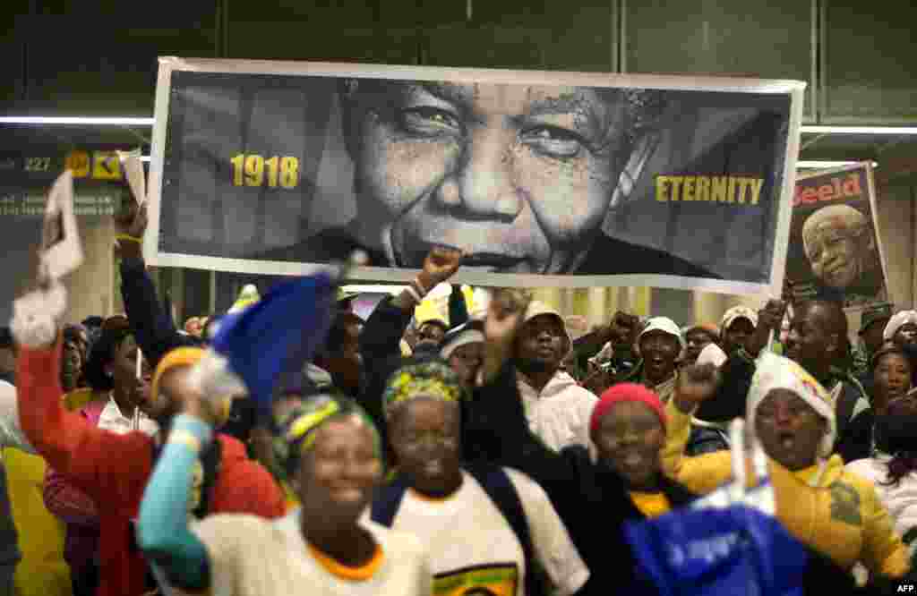 Стадионго келгендер Манделанын сүрөтүн көтөрүп, анын элесине таазим көрсөтүштү.